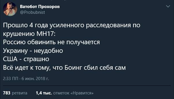Премьер-министр Мохамад обратил внимание, что многие не считают российскую сторону виновной в инциденте. «Я могу сказать, что некоторые результаты расследования не кажутся мне правильными, как и многим людям в Малайзии», — подытожил премьер.