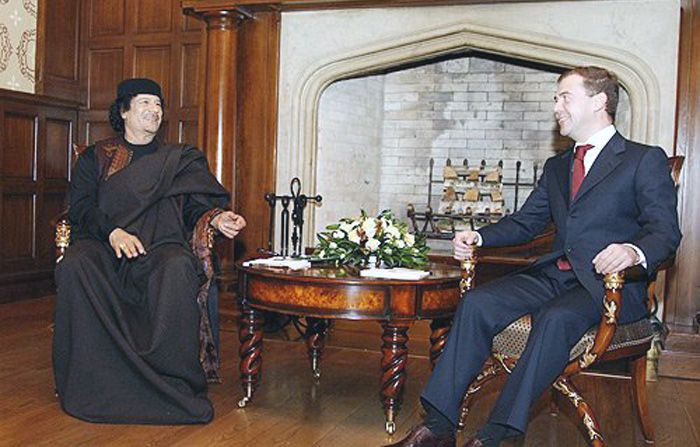 Подписанный сегодня указ Дмитрия Медведева о запрете въезда на территорию России президенту Ливии Муаммару Каддафи, членам его семьи и ближайшим соратникам, а также финансовые санкции в отношении ливийского руководства рискует окончательно поссорить Москву с Триполи и выбить нашу страну с ливийских зерновых, оружейных и иных рынков. Место России с удовольствием займут европейцы, которые как раз готовы иметь дело с семьёй Каддафи, при условии, что сам лидер ливийской революции с почётом уйдёт в отставку.