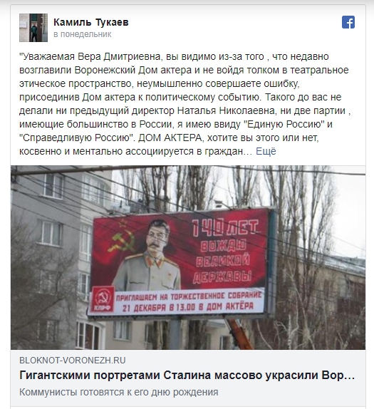 Одним из первых высказался заслуженный артист России, актёр Воронежского Камерного театра Камиль Тукаев. Он на личной странице в соцсети раскритиковал одобрение проведения мероприятия в честь Сталина в Дома актёра его директором Верой Ильяшенко.