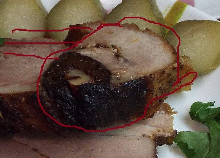 Мясо очень мягкое и нежное, но по мне - не очень: Вкуса и аромата чернослива не чувствуется ( а может я такой купил ?), в процессе запекания чернослив выдавило к поверхности мяса и оно сверху, на мой взгляд, приобрело очень темный и неприглядный вид. Я бы, не разрезав на ломти , гостям эту свининку, не рискнул показать!