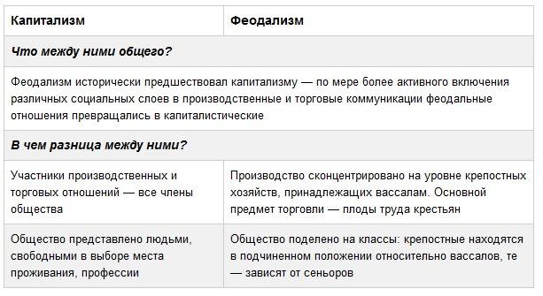 Главное отличие капитализма от феодализма, это наследование власти. При феодализме власть существует в виде абсолютной монархии, а при капитализме в виде выборов власти крупного капитала.