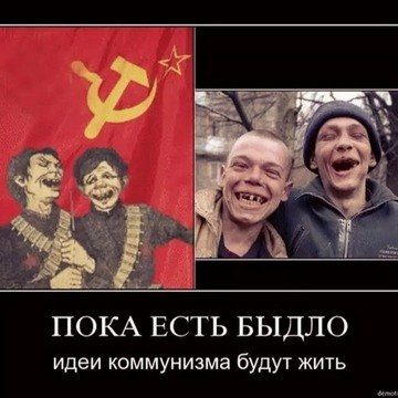 Так что не пи34ите, господа. И вообще не сс...те, коммунизма не будет, потому что разум человеку дан для того, чтобы к животным инстинктам он присовокупил хитрость, подлость и коварство. А все это для того, чтобы нахапать себе побольше материальных ценностей и дензнаков, чтобы назваться элитой. А у кого этих ценностей нет, те лузеры и нищеброды... Вот что такое капиталистическое общество.