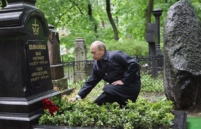 На фото: Путин возлагает цветы к памятнику Шмелева.