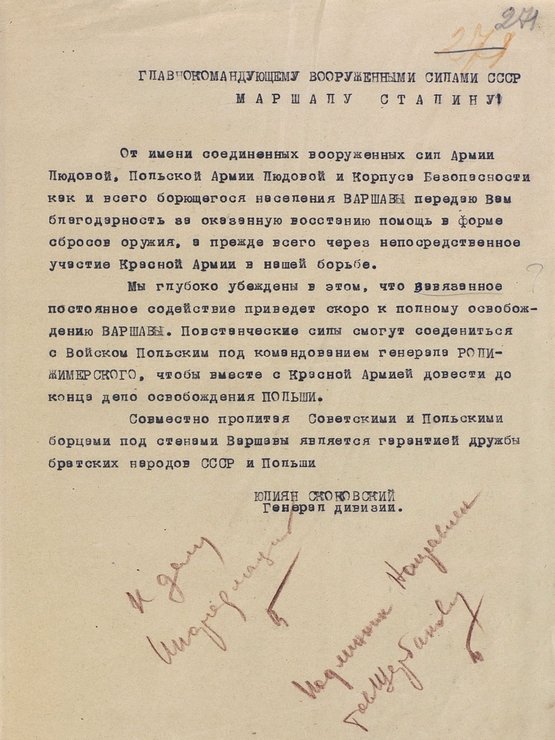 Из архивных документов следует, что командование Красной армии предпринимало все возможные попытки поддержать Варшавское восстание поставками вооружения, продовольствия, горючего, разведданными и артиллерийскими ударами, несмотря на ограниченные ресурсы и измотанность войск тяжелыми боями.