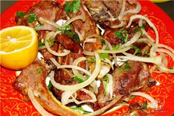 Мясо нарезать небольшими кусками, сложить в посуду, посолить, посыпать молотым перцем, добавить мелко нарезанный репчатый лук, уксус или лимонный сок и перемешать. Посуду накрыть крышкой и на 2-3 часа поместить в холодное место для маринования.