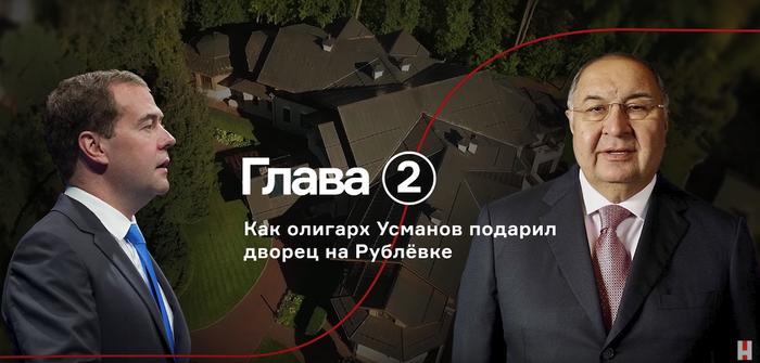 В марте Фонд борьбы с коррупцией в расследовании об активах, имеющих отношение к премьеру Дмитрию Медведеву, назвал взяткой безвозмездную передачу Усмановым в 2010 году участка площадью более 4 га около поселка Знаменское на Рублевке вместе с домом почти в 3000 м² оценочной стоимостью 5 млрд рублей некоммерческому фонду «Соцгоспроект», «который организован и управляется Медведевым». Председатель набсовета фонда — однокурсник Медведева Илья Елисеев, гендиректор — еще один однокурсник Алексей Четвертков, а предпринимательская деятельность Усманова связана с госконтрактами и различными актами, принятыми премьером.