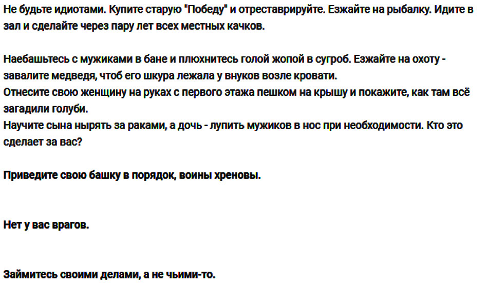 Из той же оперы предложения «поскорбеть» в День Победы. Опять вроде как хитро, а на самом деле тупо в лоб, попытка подменить понятия и противопоставить победителей и жертвы войны, а заодно подсадить в мозг «жучка», который будет разъедать – об этой Победе нужно скорбеть. Нет уж, дорогуши, скорбим мы о своих павших. А Победу мы праздновали и будем праздновать. Со слезами на глазах, но праздновать.