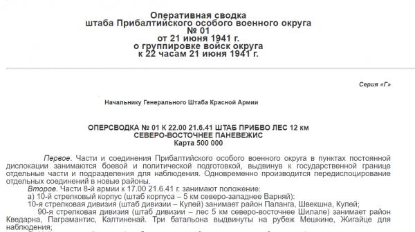 Однако уже к 21 июня все фронтовые управления, включая и фронтовое управление ПрибОВО, были развернуты на своих полевых пунктах. Свою первую оперативную сводку штаб ПрибОВО (Северо-Западного фронта), уже дислоцированный в Паневежисе, подготовил в 22.00 21 июня 1941 года.
