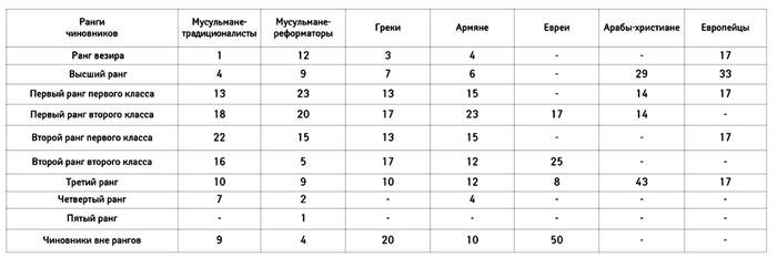 При султане Абдул Хамиде II (1876– 1909) экспертами в администрации дворца и в казначействе служили, в основном, армяне, тогда как в XVI веке евреев при дворе было немало. В османском министерстве иностранных дел с 1850 по 1908 год на 366 чиновников приходилось 107 немусульман: 30 греков, 52 армянина, 12 евреев (сефарды, ашкенази и караимы), 7 арабов-христиан из Ливана и Сирии. Кроме того, там состояли на службе 6 европейцев, не являвшихся османскими подданными, то есть иностранцы. Среди них были католики Леванта.