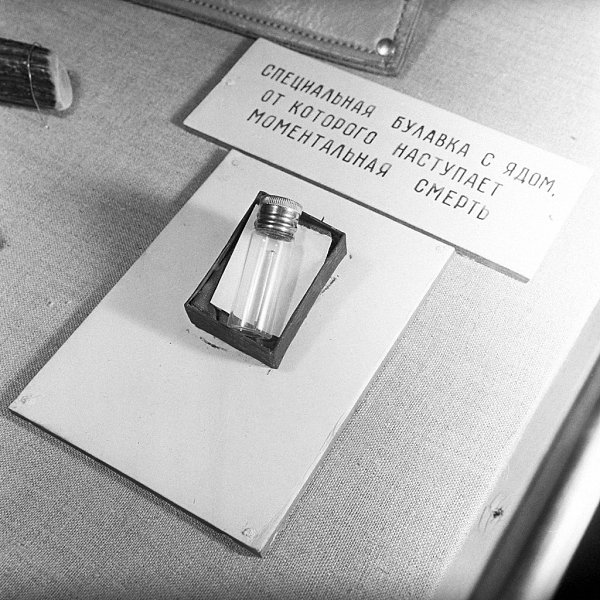 При нём были обнаружены пистолет с глушителем, охотничий нож, надувная спасательная лодка, запас питания и воды, осветительные ракеты, компас, советские рубли, золотые кольца и несколько золотых часов, полая монета достоинством в 1 долл. с отравленной иглой, взрывное устройство и шёлковый плакат со следующими словами на 14 языках: