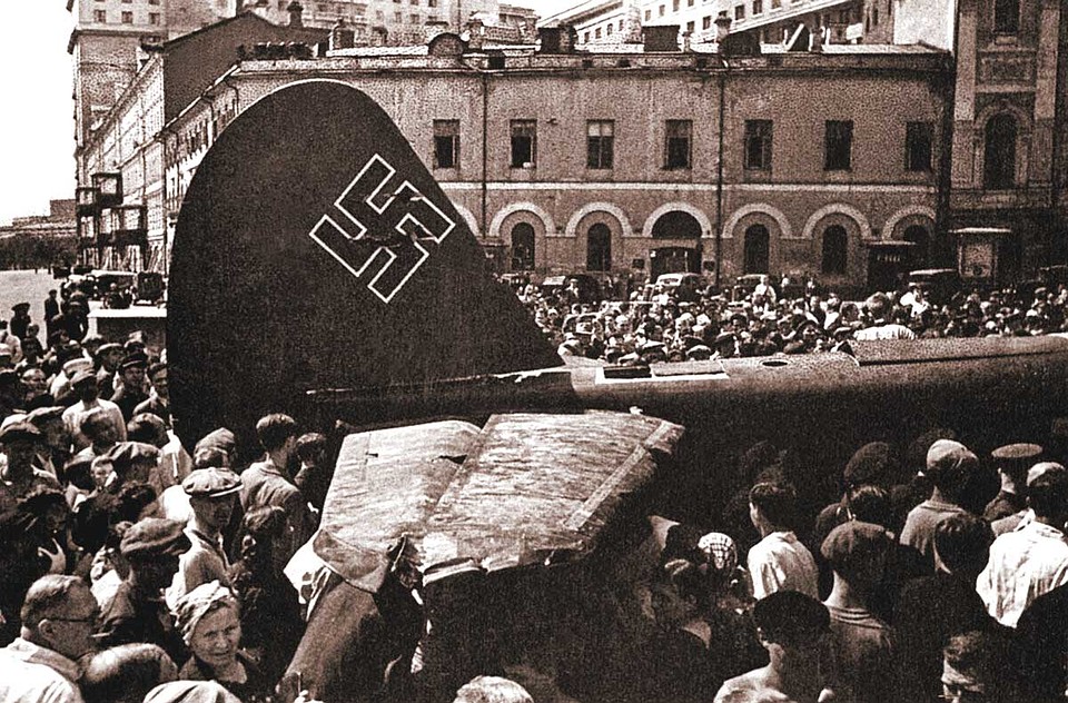 Июль 1941 года. Москвичи осматривают сбитый немецкий бомбардировщик Junkers Ju 88A–5.