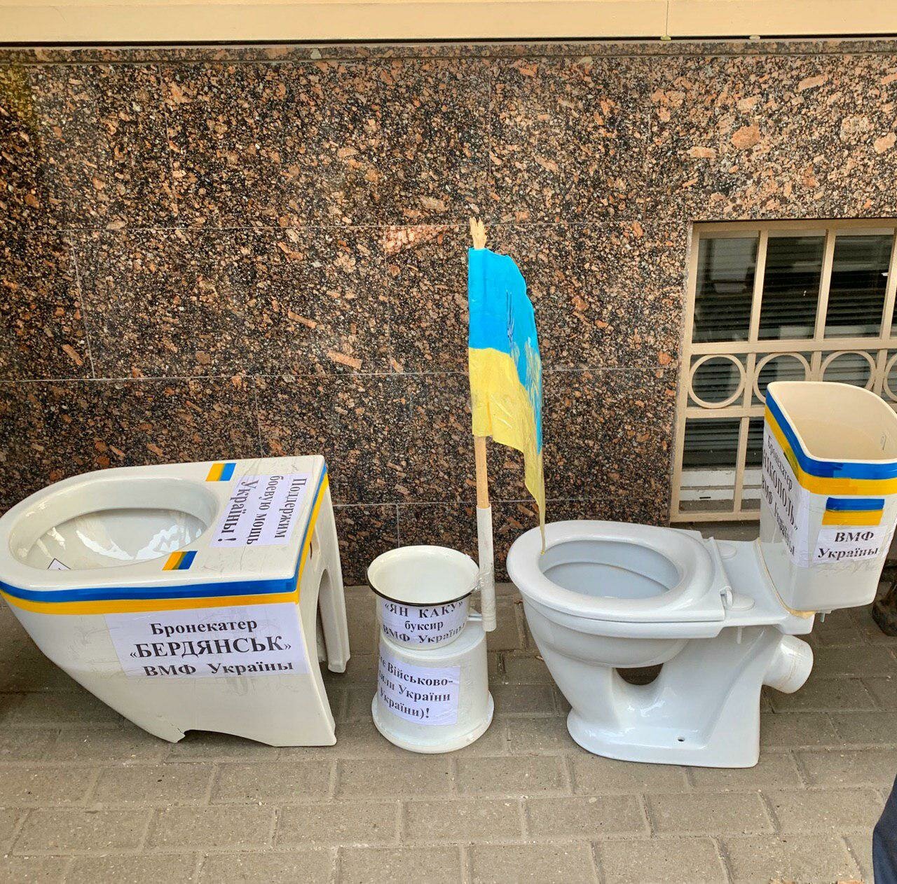 К санфаянсу прикреплены листы с надписями: "Поддержим боевую мощь Украины", "ВМФ Украины" и названиями кораблей, а также нарисованы украинские флаги.