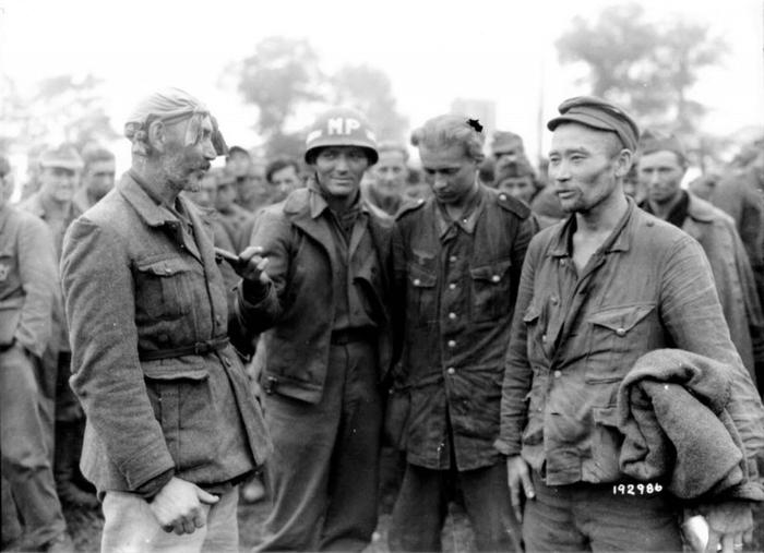 Фото: Американский военный полицейский показывает пальцем на немецкого пленного из «восточного» батальона в лагере во французской деревне Нонан-ле-Пен (Nonant le Pin).