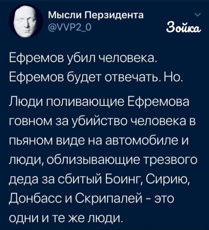 Данная история демонстрирует, что у Ефремова, виновного в тяжком преступлении, есть поддержка со стороны оппозиционной прессы. Впрочем, ничего удивительного, учитывая либеральные взгляды подследственого.