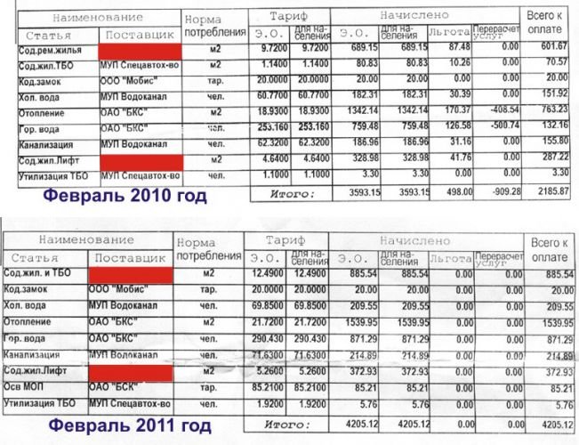 Посмотрите на платёжки. Отопление за год увеличилось в два(!) раза (763 рубля в 10 году, и 1500 рублей в 11 году). Горячая вода за год увеличилось со 132 рублей в 10 году на 871 рубль в 11 году.
