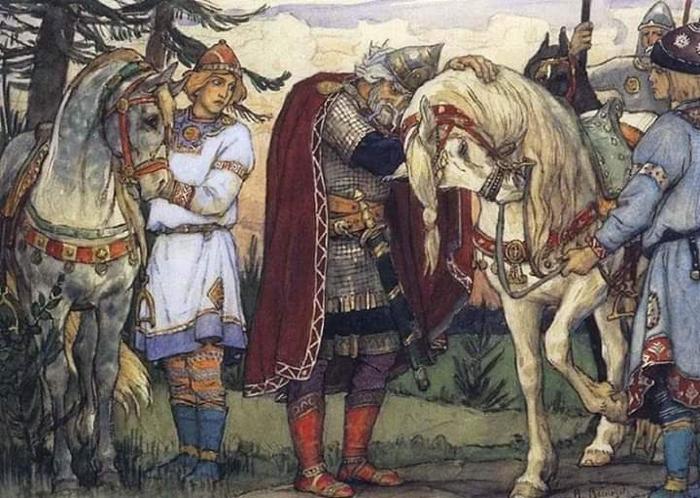 «а) в рисунке с картины ВАСНЕЦОВА «Песнь о вещем Олеге» СМОРОДКИН нанес изменения рисунка колец на ножке меча и рисунка ремешков обуви Олега. В результате получился контр-революционный лозунг — «Долой ВКП»;