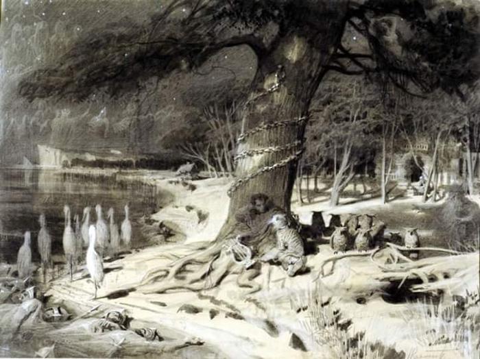 в) штриховой рисунок с картины художника КРАМСКОГО «У лукоморья дуб зеленый» делал художник МАЛЕВИЧ, который у воинов, лежащих на земле, нарисовал красноармейские шлемы и произвольно изобразил вместо четырех воинов — 6;