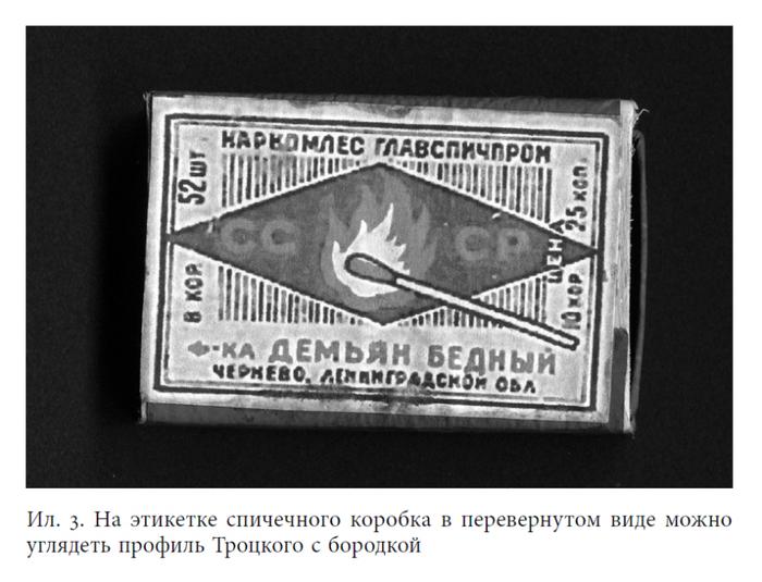 «Спичечная фабрика «Демьян Бедный» в Ленинградской области несколько лет выпускала спичечные коробки с изображением пламени. Дизайн этикетки был радикально изменен в 1937 году — возможно, произошло это из‐за распространенных слухов о том, что если перевернуть коробок вверх ногами, то вместо пламени вокруг нарисованной спичечной головки можно увидеть «профиль Троцкого»