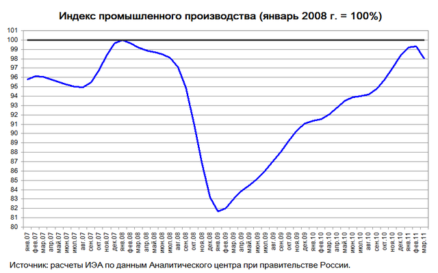 Промышленность пока так и не смогла достигнуть предкризисного уровня, достигнутого в январе 2008 г. Мартовская статистика подтвердила опасения, отмеченные месяц тому назад. Впервые после завершения промышленной рецессии в феврале 2008 г. – январе 2009 г. промышленное производство не только перестало расти, но и начало сокращаться.