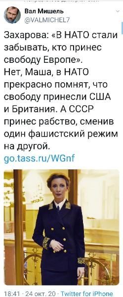 Нет, Маша, в НАТО прекрасно помнят, что свободу принесли США и Британия. А СССР принес рабство, сменив один фашистский режим на другой.