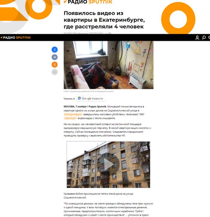 По предварительной версии, озвученной главой пресс-службой ГУ МВД России по Свердловской области Валерием Горелых, хозяин жилплощади расстрелял людей из своего охотничьего карабина "Сайга".
