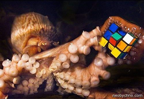Сытый осьминог не проявляет обычно интереса к пище — он не обжора, но отрезанное у того же осьминога щупальце, лишенное контроля головного мозга, упорно ползет за лакомым кусочком. Будучи сытым и спокойным - осьминог с удовольствием займет свои руки кубиком-рубика.