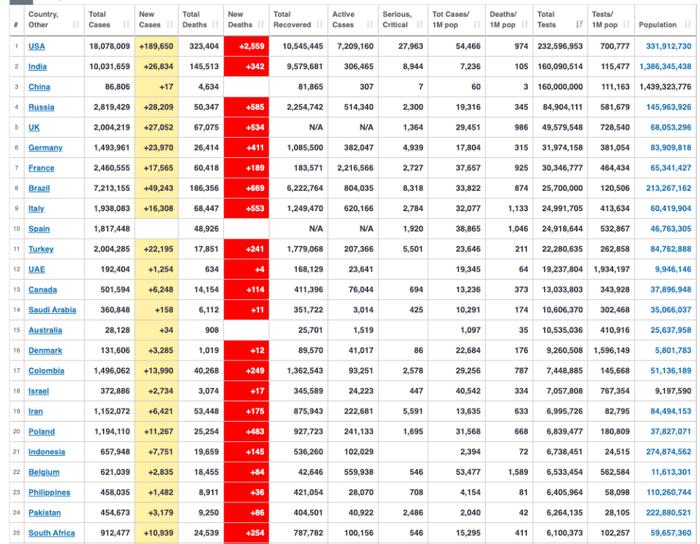 вот список стран, ранжированный по числу тестов, предпоследняя колонка - число тестов на миллион населения.