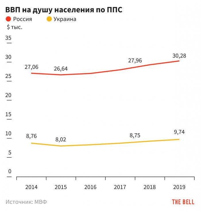 Минимальная оплата труда на Украине в 2020 году составляет 4723 гривны, а средняя — 10,92 тыс. гривен, что соответствует 165 и 397 долларам США. Минимальная и средняя зарплата в России составляют 12130 и 49021 рубль (160 и 648 долларов США соответственно).