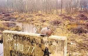 Вместе с петербургским поисковым отрядом имени Евгения Ковалёва я выхожу на станции Апраксин. У ребят есть сезонные разрешения на работы от УВД Кировского района области и уполномоченного ФСБ, два миноискателя, карта, острые стальные щупы и лопаты. Перевалив болотину и набрав в сапоги воды, мы выходим на изрытую местность. Как обычные камни, кое-где лежат плоские немецкие противотанковые мины Tmi-35 с рифлёной крышкой, попадаются ржавые хвостовики, боеголовки, гранаты. Миноискатель «поёт» на каждом шагу. Ребята копают и извлекают осколки, противогазы, куски касок. Бытового современного мусора почти нет, так как местные деревенские жители отсутствуют: деревни сметены в войну.