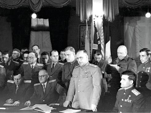 Легенда № 2 (имела хождение в бывшем соцлагере): В Реймсе был подписан не Акт о капитуляции, а всего лишь предварительный протокол. Настоящая же * См., например, Леонид Порицкий. «Акт о военной капитуляции Германии: «Предварительная процедура» в Реймсе и «Официальная ратификация в Берлине».
