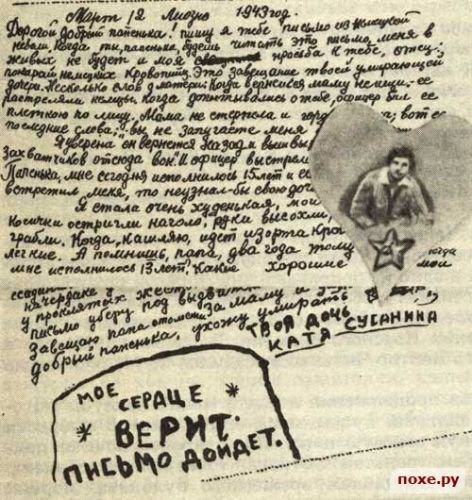 Пишу я тебе письмо из немецкой неволи. Когда ты, папенька, будешь читать это письмо, меня в живых не будет. И моя просьба к тебе, отец: покарай немецких кровопийц. Это завещание твоей умирающей дочери.