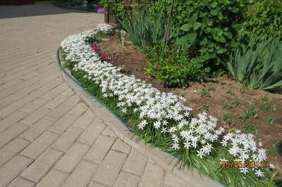 Будем дачу благоустраивать. Хочу многолетние цветочки вдоль вот приблизительно такой дорожки посадить, может, подскажете невысокие какие-нибудь и неприхотливые? Чтоб росли и росли... про армерию читаю сейчас - вроде подходит, бывают 15 см всего высотой.