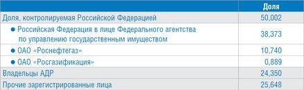 «Газпром» — крупнейшее акционерное общество в России: зарегистрировано несколько сотен тысяч владельцев акций, проживающих как в России, так и за рубежом. Крупнейшим акционером «Газпрома» является государство. В середине 2005 г. в результате приобретения государственной компанией ОАО «Роснефтегаз» 10,74% акций ОАО «Газпром» доля Российской Федерации в акционерном капитале ОАО «Газпром» увеличилась до контрольного пакета (50,002%). Это позволило усилить государственный контроль над компанией, имеющей стратегическое значение для экономики страны.