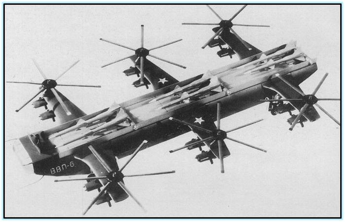 Проект ВВП-6 предлагал строительство тяжелого многороторного вертолета, предназначенного для несения особой полезной нагрузки. Тогда как другие винтокрылые машины предназначались для перевозки солдат, оружия, боеприпасов и техники, новый образец должен был брать на борт ракеты зенитного комплекса С-75 – причем вместе с пусковыми установками. По сути, предлагался оригинальный вариант зенитного ракетного комплекса на винтокрылой платформе, пригодный для быстрой организации противовоздушной обороны на опасном направлении.