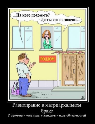 а поддевать мужичков вот так простенько - оно, канешно, забавно, однак, я прочел несколько их опусов и многое для себя открыл, например, про статистику детей в браке не от мужей, как тут на картиночке, или про то, как на судах мужья не могут выйцти из тупиков, в которые их загнали вот такие милые тетечки с помощью подставных детишков, и как-то весело не становится - есть же ж поговорка "от тюрьмы да от сумы..."