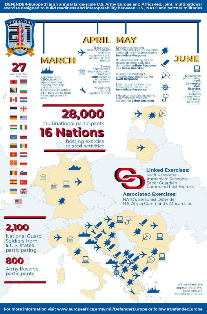 Основываясь на успехе прошлогодних учений, DEFENDER-Europe 21 включает в себя большее количество стран-союзников и партнеров НАТО, осуществляющих деятельность на более широкой территории, чем планировалось в 2020 году. Более 30 000 многонациональных сил из 27 стран будут проводить почти одновременные операции в более чем 30 учебных направлениях в десятке стран.