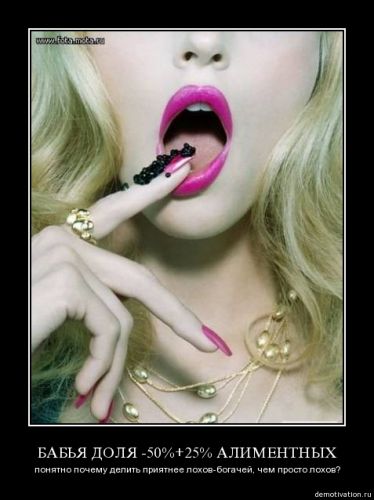 Поэтому, чтобы не было флуда, повторю свою мысль - мужчина должен содержать женщину, будучи твердо уверенным при этом, что он защищен Законом так, чтобы быть уверенным, что все его усилия, труды, содержание не смогут быть порушены в одночасье. В противном случае - не должен содержать.