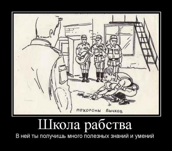 На нацистских концентрационных лагерях куда сгоняли евреев красовалась надпись; «труд делает людей свободными». Теперь это называют цинизмом и всячески осуждают. Но при этом в нашей собственной стране, провозгласившей демократию и права человека, до сих пор существует выражение; «армия делает из мальчика мужчину». Конечно делает; с отбитыми почками, без ног, без кишечника, или еще круче в цинковом гробу: зато настоящий мужик! А это вам не хухры – мухры ! (по тому какие «настоящие» мужчины возвращаются из российской армии в принципе можно судить по истории Сычева и Рудакова). Или есть еще более циничное выражение: «армия- школа жизни мужчины». Хорошо, согласимся на пару минут. Но в таком случае ответьте мне, что является школой жизни для девушки? Ведь если речь идет о равноправии, то и у прекрасного пола должна быть какая то школа жизни, но ее отчего то нет. А почему?