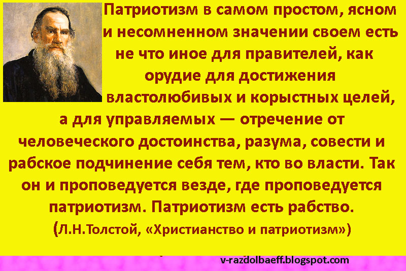 "Патриотизм в самом простом, ясном и несомненном значении своем есть не что иное для правителей, как орудие для достижения властолюбивых и корыстных целей, а для управляемых – отречение от человеческого достоинства, разума, совести и рабское подчинение себя тем, кто во власти."