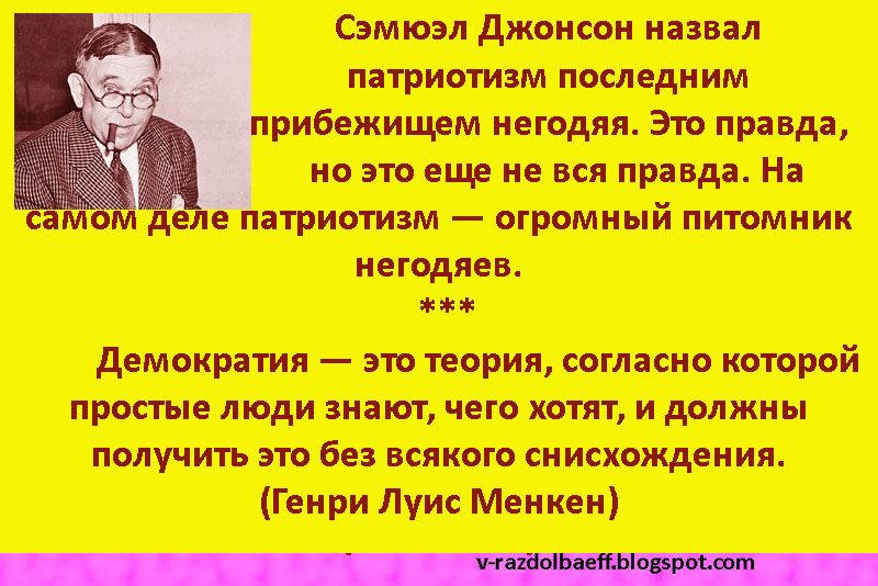 "Российский народ, в силу общего соотношения всех качеств всех людей, структурируется негодяями кверху. Хорошие, умные, работящие люди всегда оказываются в подчиненном положении. Вот как только после любых пертурбаций пирамида утрясается – дерьмо вверху, голова сбоку, руки сзади ног" (М.И.Веллер)