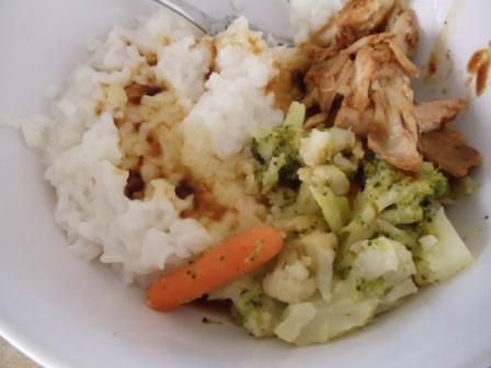 Очень диетическое блюдо. Вареный рис, овощи либо отварные либо на пару, барбекю курица (жареная курица в нее добавлен барбекю соус, в России есть такие соусы «Дымок»), заправлено соевым соусом для суши-роллов.