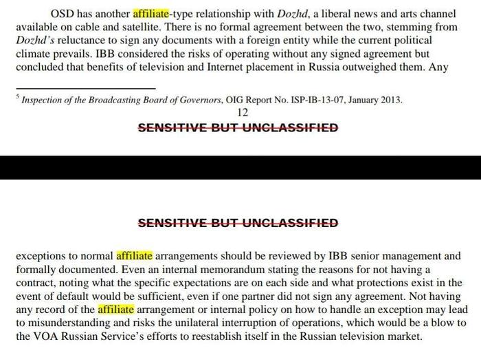 Телеканал «Дождь» является аффилированным СМИ американского государственного агентства BBG (делает «Радио Свобода», «Голос Америки» и остальные государственные СМИ США), говорится в отечете Госдепа о проверке BBG.