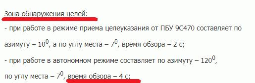 "В результате испытаний была получена дальность обнаружения самолетов РЛС самоходной огневой установки в автономном режиме работы от 65 до 77 км на высотах более 3000 м, которая на малых высотах (30-100 м) уменьшалась до 32-41 км. Вертолеты на малых высотах обнаруживались на удалении 21-35 км. В централизованном режиме работы из-за ограниченных возможностей выдающей целеуказания самоходной установки разведки и наведения 1С91М2 дальности обнаружения самолетов уменьшалась до 44 км для целей на высотах 3000-7000 м и до 21-28 км на малых высотах."