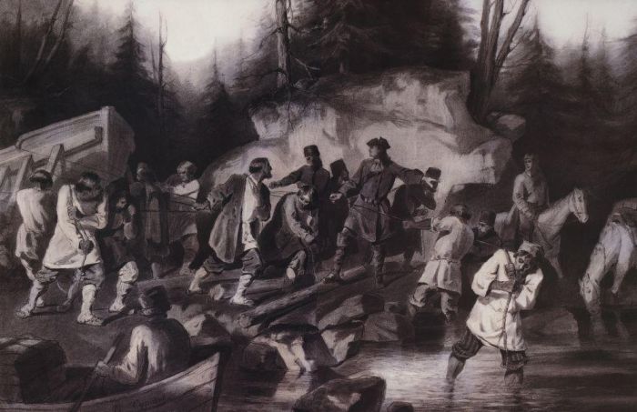 Петр Великий перетаскивает суда из Онежского залива в Онежское озеро для завоевания крепости Нотебург у шведов. Бумага, уголь, граф, карандаш.