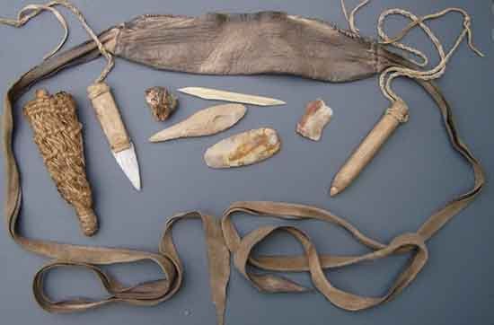 Помимо кошеля, Эци имел и заплечный мешок-рюкзак из кожи и меха. В нем он держал два короба из бересты (в одном сохранились угольки для розжига), аптечку с лекарственными травами, запасную тетиву для лука, веревочку, олений рог (который использовал как нож), охотничью сеть.