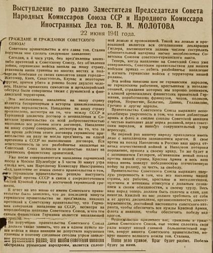 Сегодня, в 4 часа утра, без предъявления каких-либо претензий к Советскому Союзу, без объявления войны германские войска напали на нашу страну, атаковали наши границы во многих местах и подвергли бомбежке со своих самолетов наши города — Житомир, Киев, Севастополь, Каунас и некоторые другие, причем убито и ранено более двухсот человек. Налеты вражеских самолетов и артиллерийский обстрел были совершены также с румынской и финляндской территорий.