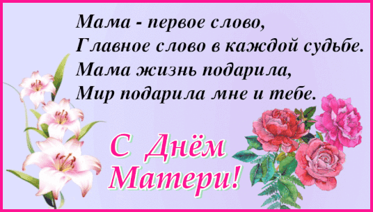 Поздравляю всех матерей с Праздником. Молодых и пожилых, мам бальзаковского возраста и матушек с платками на голове, которые встают по утру пока все спят, что бы подоить корову и подать на завтрак пироги и сметану. Я поздравляю всех матерей России.