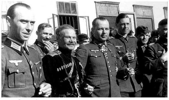 Тогда же, осенью, П.Н. Краснов написал текст присяги для вступающих в казачьи части вермахта. Обуреваемый амбициями, известный генерал, как и в 1918 г., находился в тесных контактах с немцами и с их помощью всегда надеялся взлететь на Олимп власти. Тогда, в 1918-м, став атаманом Войска Донского, в этих целях он провозгласил его Всевеликим войском Донским, что внесло разброд в Белое движение, выступавшее под руководством виднейших генералов М.В. Алексеева и А.И. Деникина за «Великую, единую и неделимую Россию». Однако в начале 1919 г. он потерял атаманскую булаву и удалился под крыло германских хозяев. С приходом Гитлера к власти, он вступил в лоно фашизма и превратился в верного лакея его фюрера.