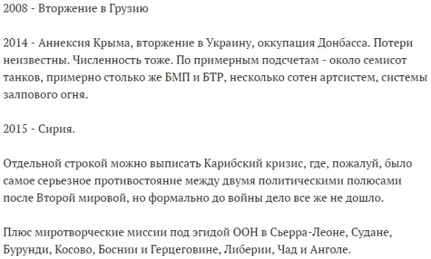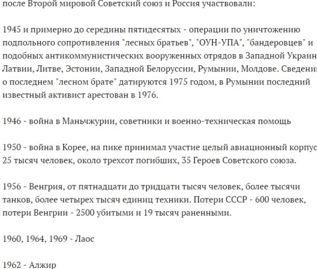После окончания Второй Мировой войны в 1945 году Cоветская - Российская армия участвовала почти в 60 войнах и вооружённых конфликтах за границей, потеряв десятки тысяч молодых жизней и $ сотни миллиардов долларов.
