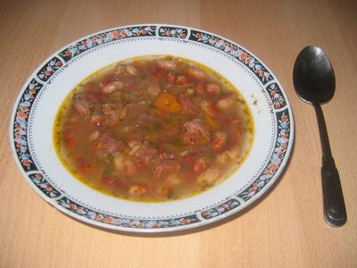 Обжарить лук и чеснок в разогретом оливковом масле, добавить фарш, или кусочки мяса, красный болгарский перец, добавить фасоль и варить до мягкости, добавить специи и томаты в с.соку и кипяток, это может быть густое блюдо или суп в зависимости от количества жидкости, в конце много зелени, подавать с лаваш...